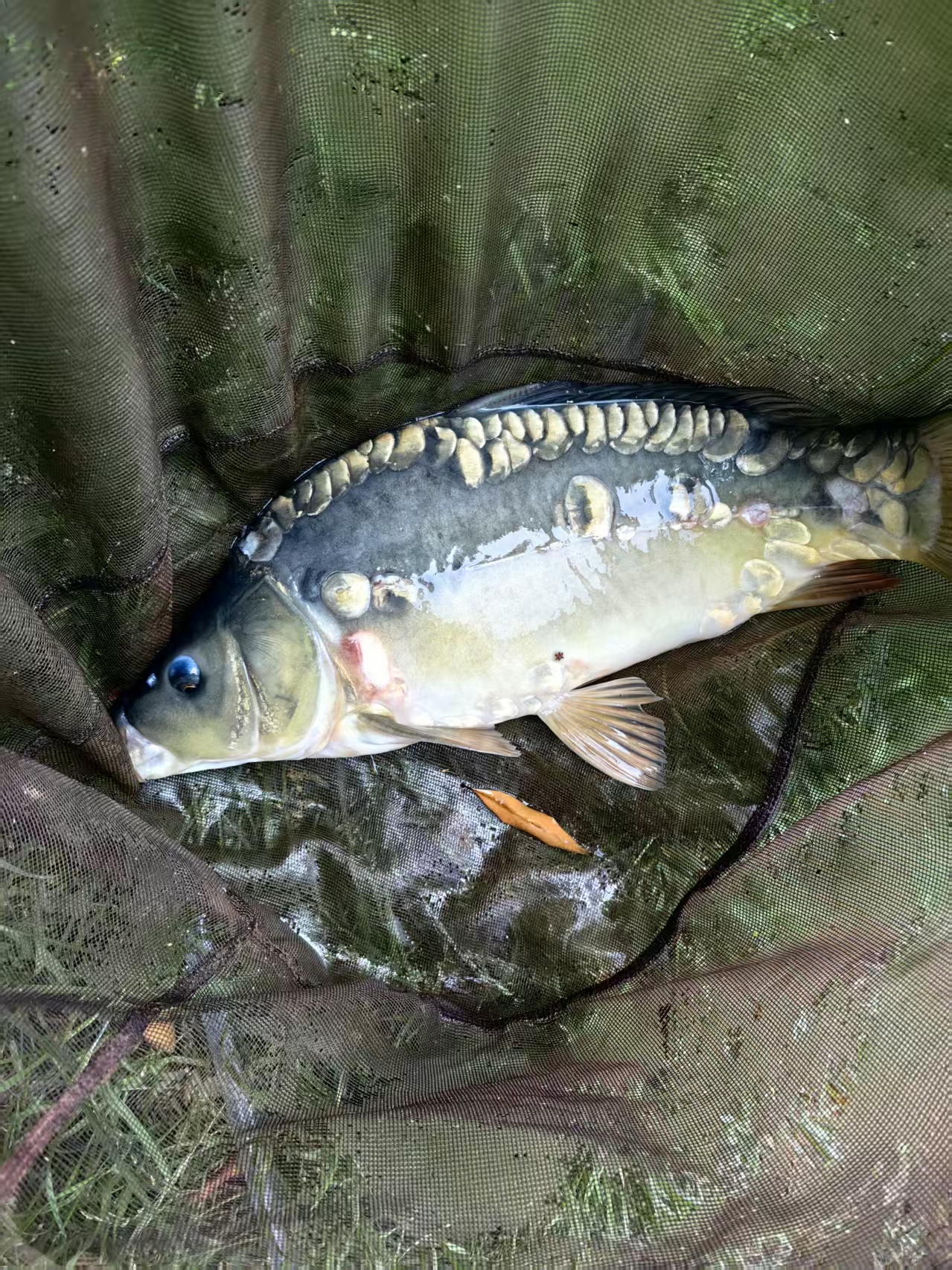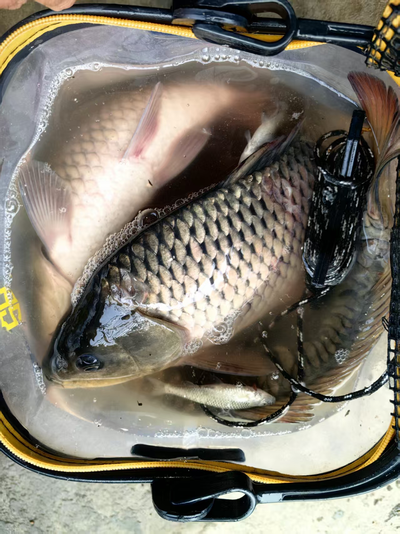 第三条来得最有戏剧性。我当时正低头玩手机,余光瞥见浮漂没了,赶紧抬竿,结果鱼已经吃了死口,钩子都吞到嗓子眼了。这条最小,但也有两斤多。摘钩费了半天劲,满手粘液。